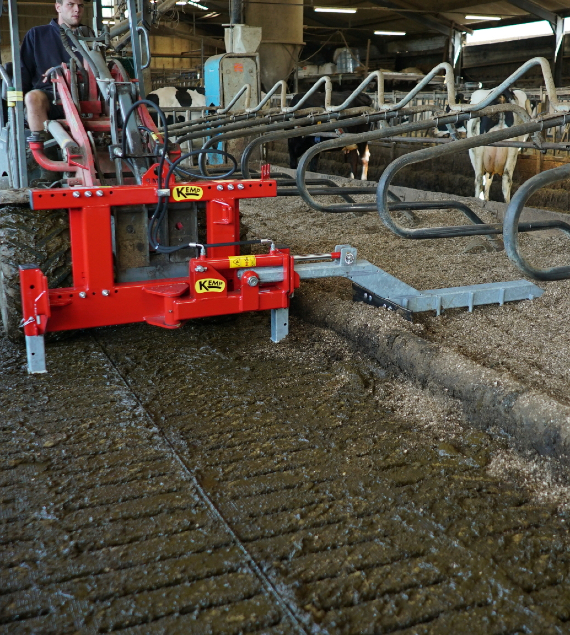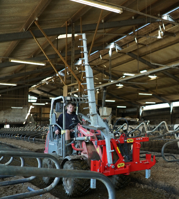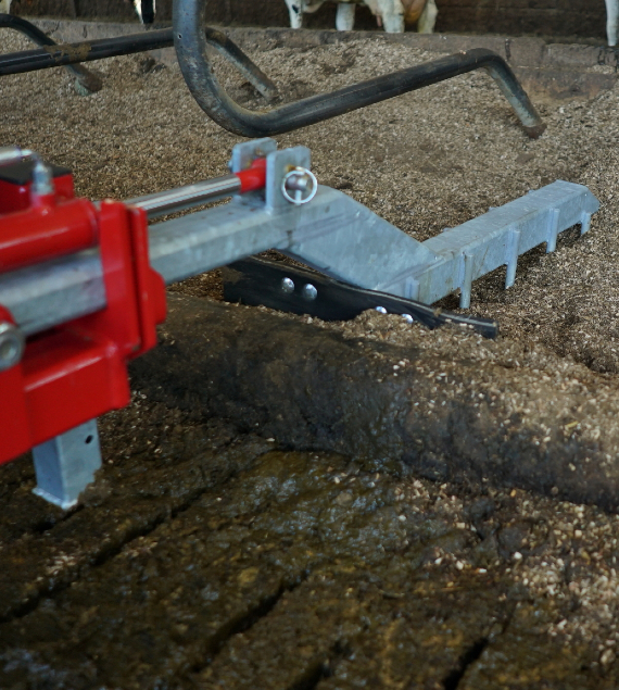 The deep litter rake is designed to push the top of litter under the box in the bedding of the cow. Hereby the lounge is smooth and softer, and the litter dries better thus reducing the risk of diseases. To scrape the litter back in the lounge, topping up is less needed to still keep sufficient litter in the box, resulting in a litter savings. The deep litter rake is designed to work with a wheel loader and scrape litter as solid fraction, compost, chopped straw or sand surfaces in a floating box.
