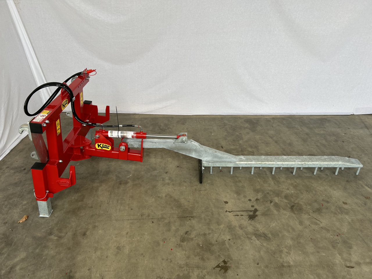 The deep litter rake is usable to the left and the right side with one double-acting control valve, the rake is locked in the folded position and in working position and can be used pushing and pulling. Tilting is the tipping function of the wheel loader. While moving, the rake can be adjusted in height and the rake continues to follow the ground.