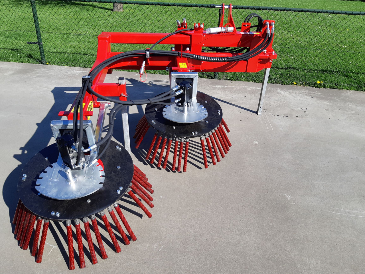 The double weed brush is an innovation on the standard weed brush. The advantage of a double brush is that a larger surface can be brushed in the same time. The brushes have the same direction of rotation so that the dirt is drained on one side.